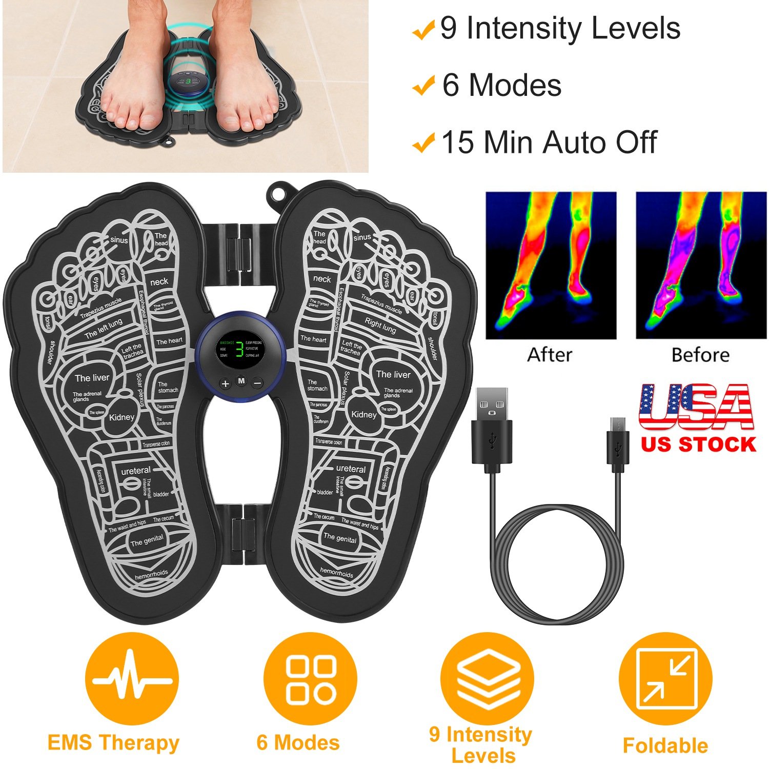 Are you troubled by foot pain and afraid to take that dreadful first step in the morning? Does your body and feet feel sore and achy from long time standing or walking? Our electric foot massager with technology which elicits muscle contraction by electric impulse, helps to muscle and feet pain relief. It has 6 modes and 9 intensity levels, you can adjust it as you like. It suits for all foot types and different foot sizes.