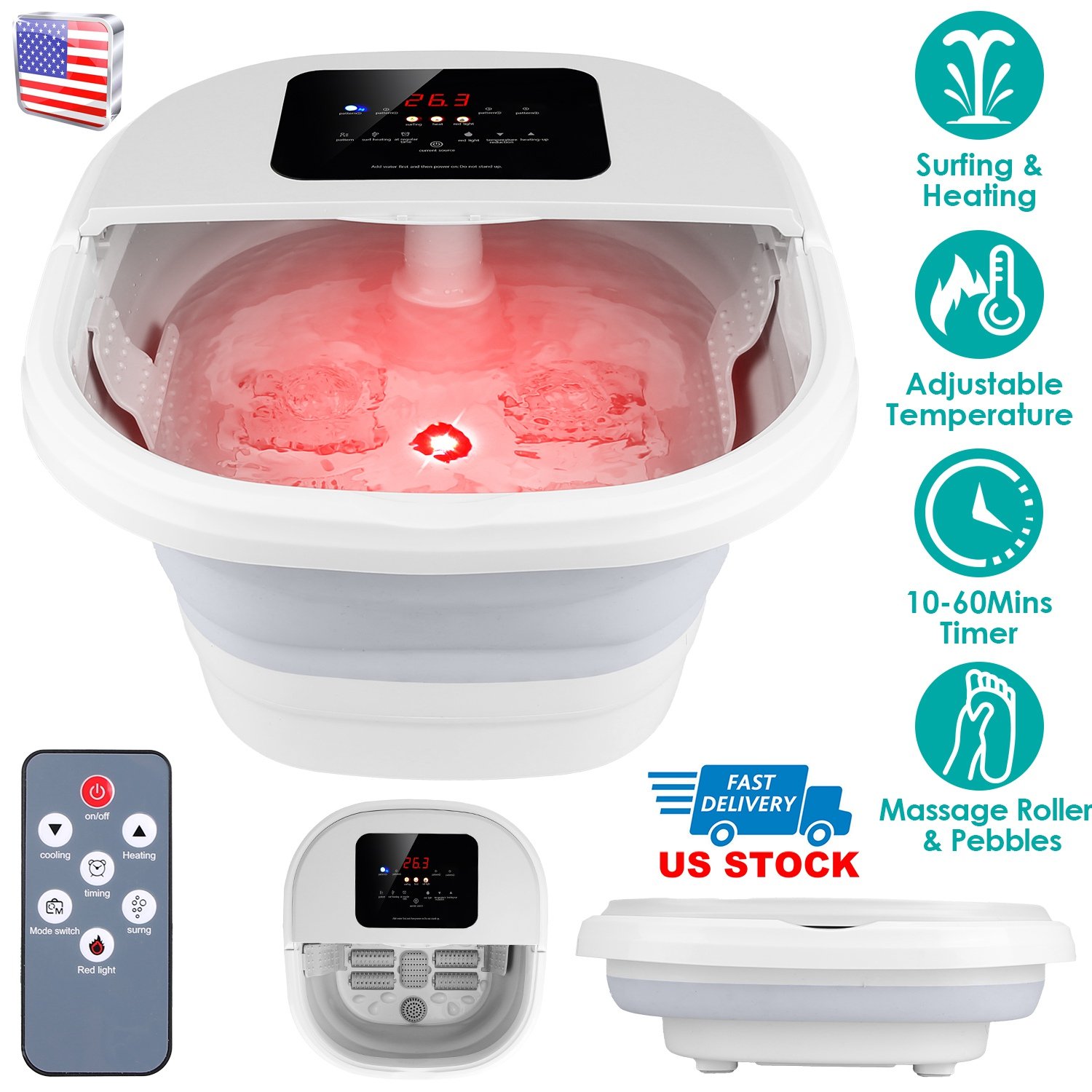 After a hard day\'s work, it\'s great to take a foot bath to relax yourself! Our electric foot bath tub is a great choice for you. Equipped with surfing & heating, red light and 8 rollers and simulated pebbles on the bottom, you can customize it to the mode you want to meet your personal needs. Perfect for relaxing in the evening, reading or watching a movie. You can also adjust the temperature from 95-118.4℉ and set 10-60mins working time according to your need. When not in use, it can be folded up to store under the sofa/bed, which is super space-saving. Collapsible handle makes it easy to carry from one room to another room. A perfect gift to take care of the health of your whole family! They will love the experience of foot massaging!