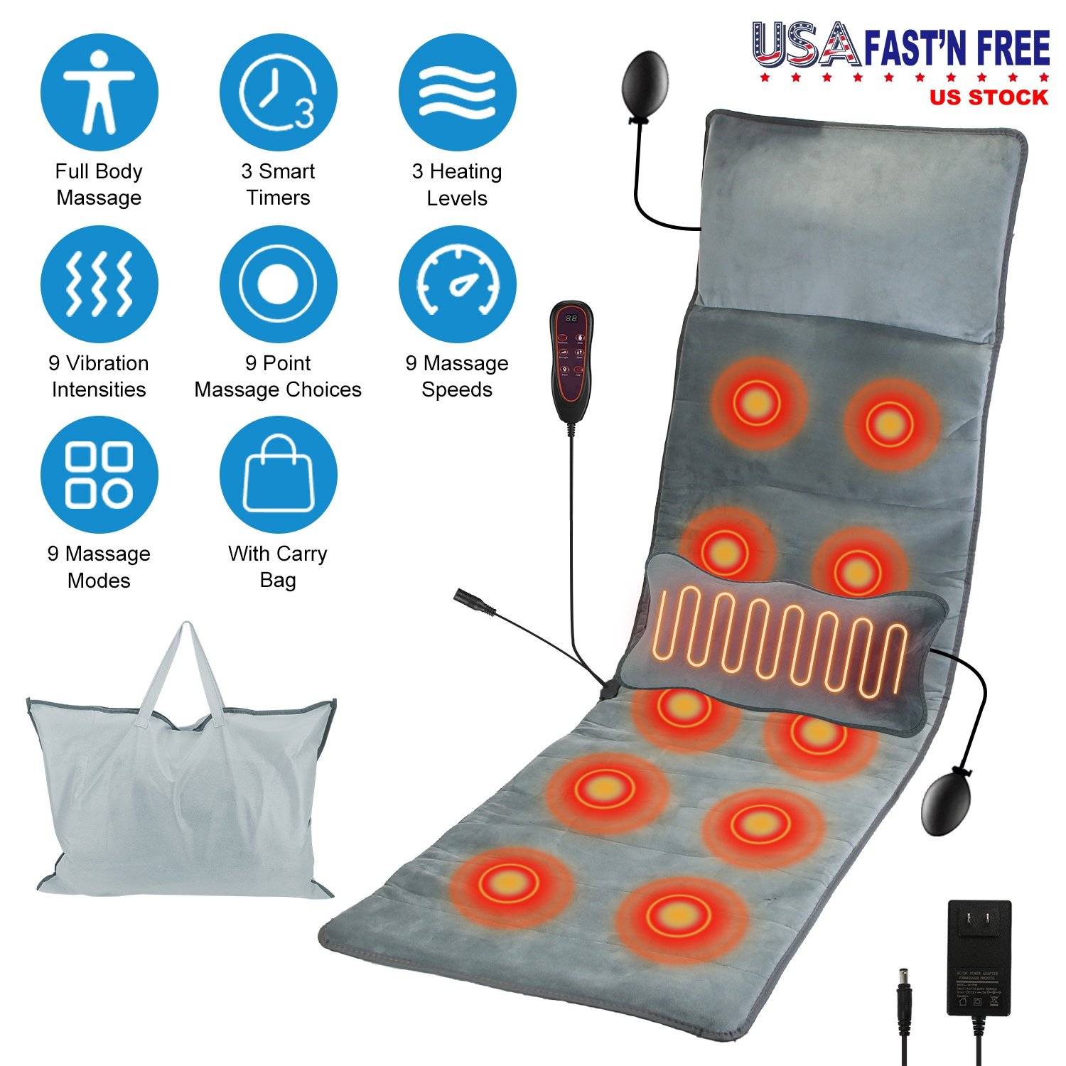 No need to spend extra money and time to go to massage shop. Our full-body massaging pad with inflatable head pillow and lumbar pillow made of skin-friendly plush brings you therapeutic massage experience. The mat with 10 massage points can massage your Back, Buttock, Waist, Thigh and Calf. Heating function on the waist area helps to release muscle tension, stress, and fatigue. You can choose multiple vibration modes in different intensity and different speeds as you hit all the right spots. Besides, 3 smart timers can be chose to customize you massaging time. Great to enjoy massaging on the chair, bed, couch, etc. comfortably. Perfect gift to take care of the health of your grandparents, parents, husband, wife or friends in Mother’s day, Father’s day or birthday.