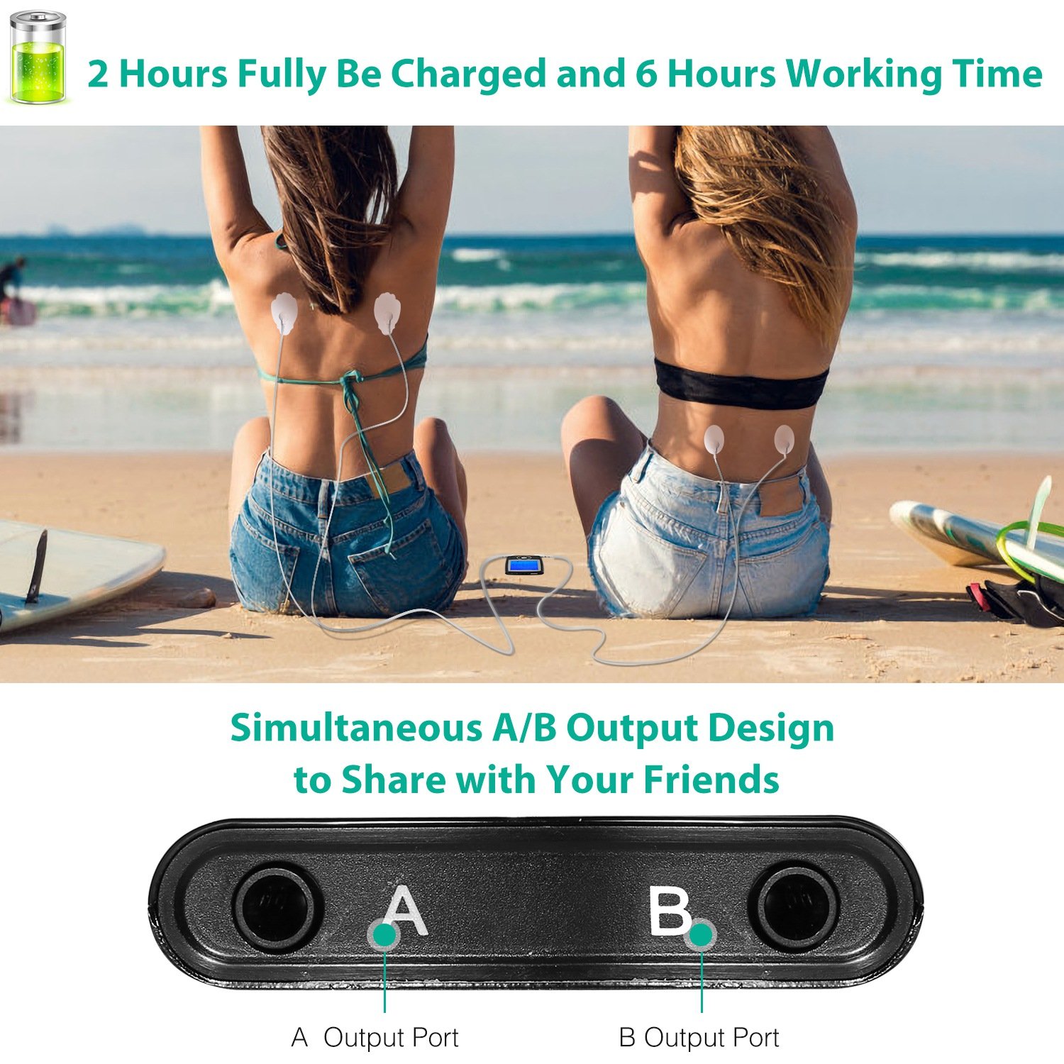 Are you disturbed by the aching of neck and shoulder due to the long seating working? Are you soared of muscles due to high-intensity sport? Are you still fighting with insomnia? If yes, our tens unit machine impulse massager can help to reduce your pain and relax your body. Featured with 16 working modes,20-level intensity, A/B outputs and 2 electrode wires(with 2 wire connectors per electrode wire), our muscle tens can work up to 6 hours and only 2 hours fully be charged, you can share with your friends. Its compact size and easy operation enable it to be easily carried when you travel. An ideal gift for office workers, excessive sport injuries, phubbers and housewife with piles of housework.
